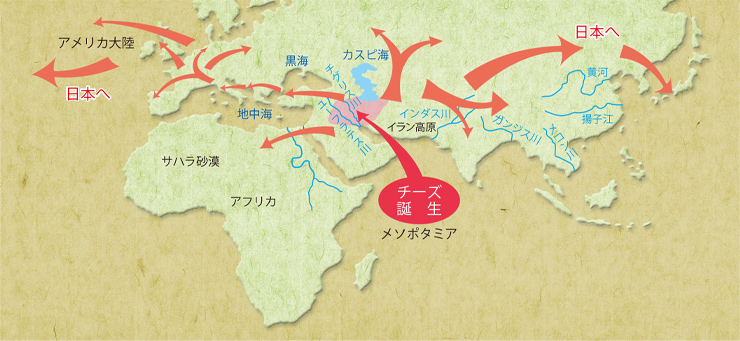 人類は紀元前6000年頃に家畜からミルクをしぼり、それを乳製品として食べていました。その後、おおよそ2000年経った紀元前4000年頃に、チーズはメソポタミア地域(チグリス川、ユーフラテス川流域)で生まれ、そこを起源として東西に広がっていったといわれています。