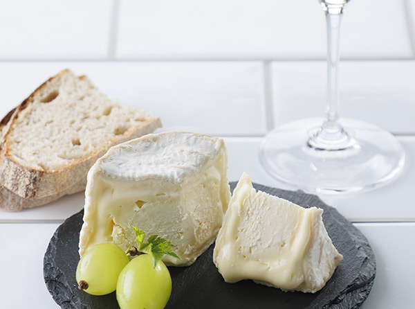 なめらかな白カビに包まれた表皮は薄く、中身は濃厚でフルーツの香りが混じった芳香があります。コクがあり、舌の上にもしっかりとした旨みと後味が残り、外皮も味わいがあります。