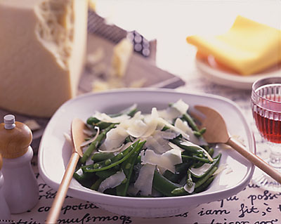 イタリア語で雌羊のことをペコーラ。ペコリーノとは、羊のミルクで作るチーズのことをいう。羊乳チーズというとフランスのロックフォールが有名だが、このペコリーノ・ロマーノもイタリアを代表するチーズのひとつだ。色白の肌を持ち、中はうっすらとした黄色。一見都会的な風貌だが、2000年以上昔すでにローマ軍兵士の携行用食糧にもなっていたというから、歴史ある偉大なチーズなのである。直径20、30cmの円筒形でけっこう大型。外皮には名前が刻印されているのでわかりやすい。携行食になるだけあって塩味が強いが、口に含むほどに熟成の旨みが広がりあとをひく。イタリアでは粉にして調味料的に利用することが多いという。ローマ近郊の村では初夏になると生のそら豆と共に食べる習慣があるとか。ここでは茹でたえんどう豆にチーズを削って乗せてみた。ワインと一緒に楽しめる。