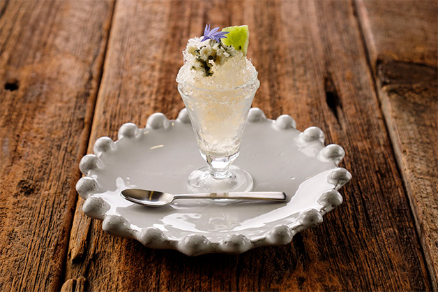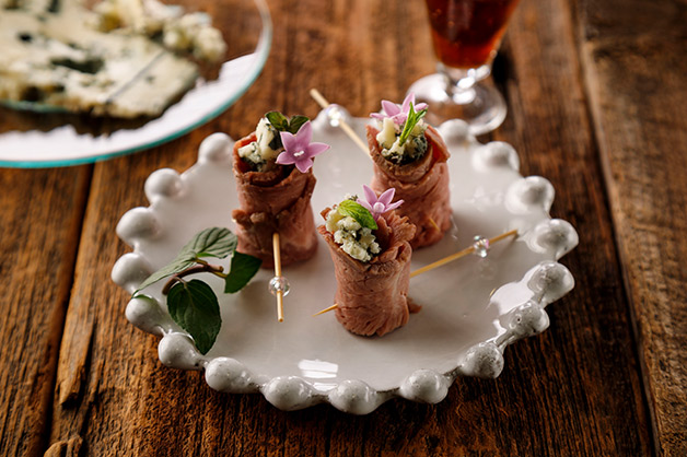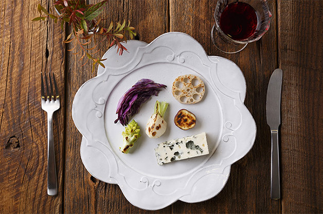 チーズ好きの行き着くところブルーチーズ、という声がある。となれば、極めつけはロックフォールではないだろうか。真っ白なボディに美しい青緑色のマーブル模様。喉から鼻孔に突き抜けるような青かびの刺激と、クリーミィなチーズとが相まった印象強い味はチーズ好きを唸らせる。1998年サッカーのワールドカップで、日本が初戦を戦ったフランス西部の都市トゥールーズから東へ150km。荒涼とした大地の中に忽然と巨大な岩山が姿を現す。この山肌にへばりついたような集落がロックフォール村。ここの岩山の洞窟で熟成させたものしかロックフォールを名のることはできない。それがまた、食指をそそる。洞窟の中にはいつも冷涼な風が漂い、かびの胞子を運んでくるという。写真のメニューはロックフォールとパパイヤのオープンサンド。フルーツの瑞々しさと自然の甘味が、ピリッとした刺激を口当たり良く包んでくれる。