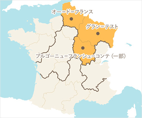 シャンパーニュ地方の南側はワインの産地として有名なブルゴーニュ地方で、森や林、湖のある自然豊かな風景に変わっていきます。また、東へ向かうとロレーヌ台地の穀倉地帯、北へ向かえばベルギー、ルクセンブルグ、ドイツとの国境、東側はヴォージュ山脈です。ヴォージュ山脈を越えた東側はアルザス地方になります。