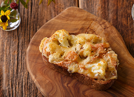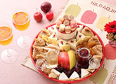 シャンパンの産地としても有名なフランス・シャンパーニュ地方ラングル高原が原産地のチーズ、ラングル。一番の特徴は、表面に泉(fonteine=フォンティーヌ)と呼ばれる噴火口のような窪みがあること。熟成期間中にチーズを一度も反転させないため、熟成に伴いだんだんと窪みが深くなり、ラングル独特の大きく窪んだ形状が生まれます。通はこの窪みに少量のマール・ド・シャンパンやマール・ド・ブルゴーニュを注いで楽しむとも言われます。フォンティーヌに、白ワインに漬けたドライレーズンとドライオレンジをのせて、器に見立てたアレンジも素敵です。