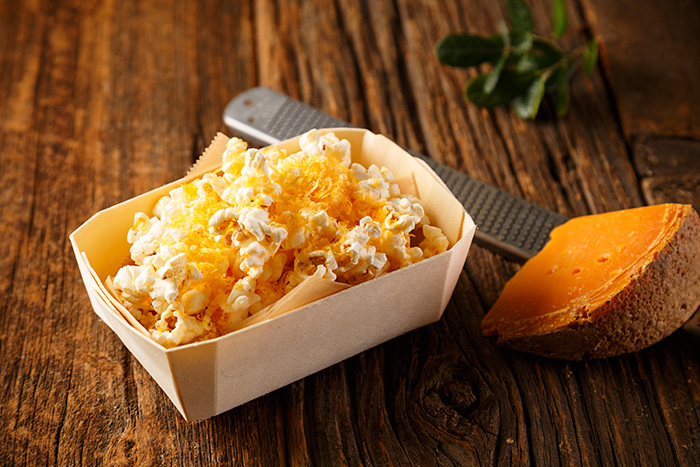出来たてアツアツのポップコーンと合わせれば、とろけた「ミモレット」を程よくまとい、後を引く美味しさです。