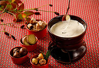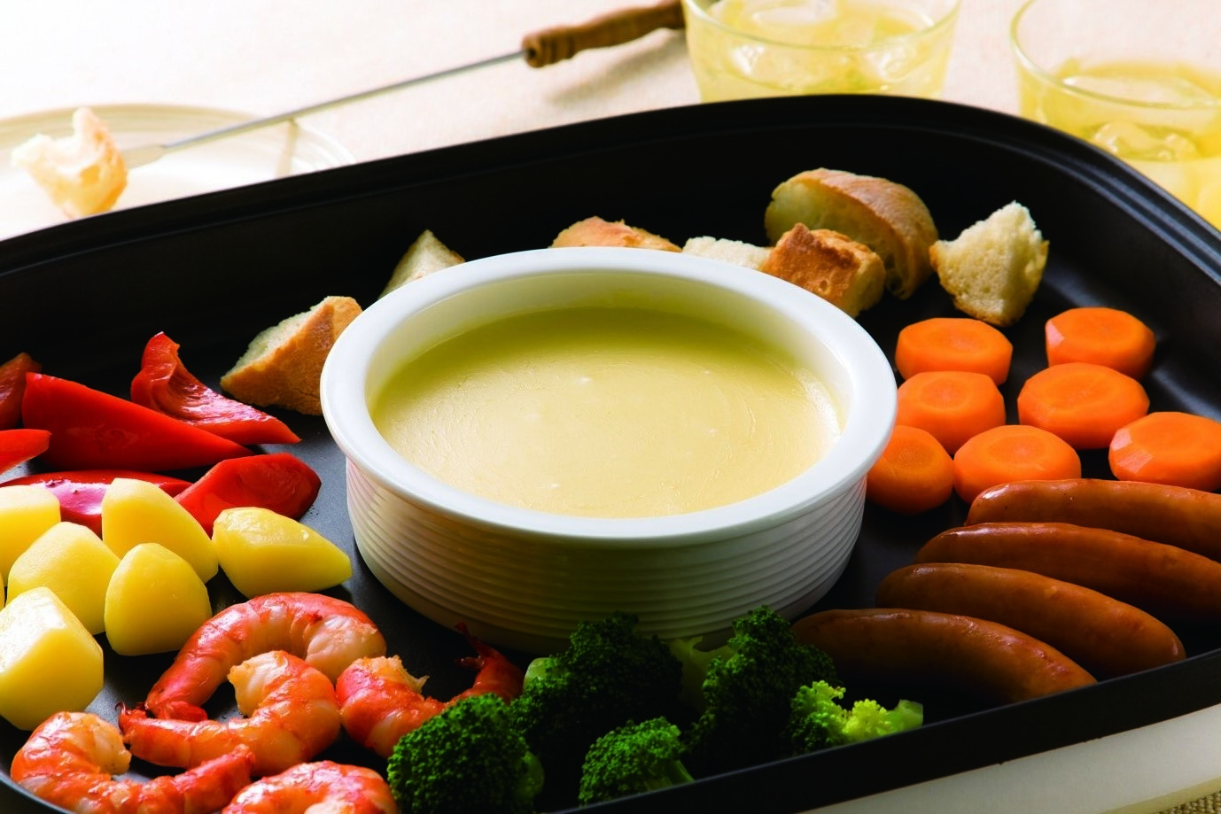 手順は、耐熱皿にチーズと白ワイン(もしくは牛乳)を入れて、ホットプレートの上でお好きな具材と一緒に温めるだけ。チーズがとろけたら、具材につけていただきましょう。チーズは市販の「シュレッドチーズ」でも十分ですが、「グリュイエール」と「エメンタール」を2:1の割合で混ぜると、より本格的な味わいが楽しめます。