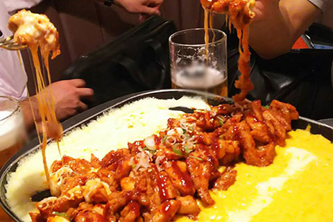 一口大にカットしてタレに漬けこんだ鶏モモ肉を、キャベツなどの野菜と一緒にごま油で炒め、全体に火が通ったら、チーズをたっぷりのせます。具・チーズ・具と、プレート上に“川の字”を作るのがおすすめ。ピリ辛のお肉と野菜を、アツアツのチーズにからめて召し上がれ!