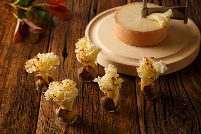 濃厚で深い味わいのスイス産「テット・ド・モワンヌ」は、専用器具「ジロール」を使って花びらのように削ることで、絶妙なコクと余韻を楽しめます。クミンパウダー・シナモンパウダーを縁にまとわせれば、味に変化と立体的な華やかさを演出できます。ヘーゼルナッツ・カシューナッツも添えて。