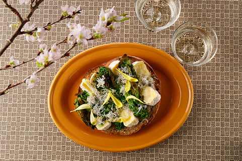 季節の食材、しらす・菜の花をのせ、「雪印北海道100 カマンベールチーズ」がこんがりとろけるまで焼いて。