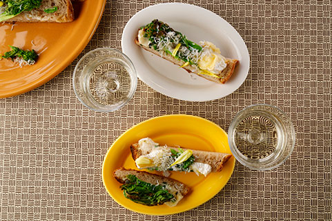 パンはドーム型ライ麦パンを水平に切って豪快に。オリーブオイルをまわしかけ、彩りに食用菊の花びらを散らして。まるでお花畑のよう。
