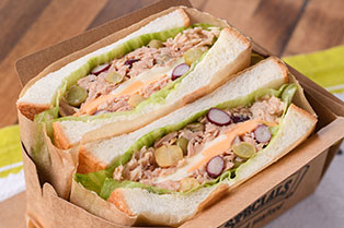 次は、チェダーチーズのオレンジ色を“断面”からのぞかせて、フォトジェニックな効果を狙うテクニックです。手作りのサンドイッチや、「ごはん版サンドイッチ」としてすっかり市民権を得た“おにぎらず”の具に、チェダーチーズを取り入れてみましょう。サンドイッチにチーズが合うのはもちろんですが、チェダーチーズは意外と“おにぎらず”との相性もよいのです。その秘密は、グルタミン酸、イノシン酸、グアニル酸という「3つの旨み成分」を併せ持ったスーパー食材・海苔にあります。海苔の旨み成分が、チーズの持つ旨み成分であるグルタミン酸との相乗効果を生み出し、さらに美味しさを深めてくれるのです。