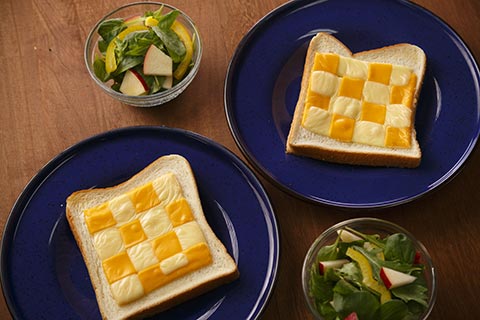 他にもハートや星形に抜いた「チェダースライス」をポタージュスープに浮かべたり、短冊状のスライスチーズと「チェダースライス」を交互に編み込むように重ね、“市松模様”のチーズトーストに仕上げたり。便利な「チェダースライス」を使えば、楽しくカワイイ“チーズレシピ”が次々と浮かんできそうですね!