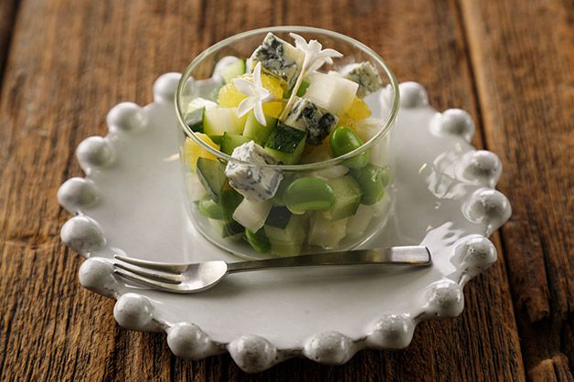 「ブルー・ド・ジェックス」・夏野菜・柑橘をキューブ形に揃えてカット。涼しげな器に盛り合わせ、仕上げに胡桃オイルをまわしかけて。青カビチーズの刺激と深い味わいが食欲をそそります。