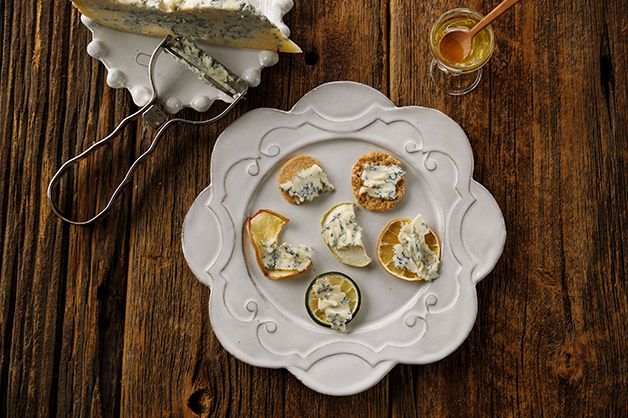 薄くスライスした「ブルー・ド・ジェックス」を様々な素材に重ねて。アクセントの効いたおつまみの出来上がりです。お好みではちみつを合わせて楽しんで。