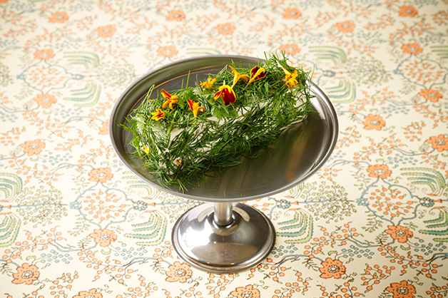 「クリームチーズ」を半分にカット、ハーブ(ディル・チャービル)をまぶし、仕上げにエディブルフラワーを飾って。ハーブの香りが引き立ち、爽やかな味わいに。