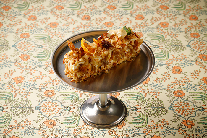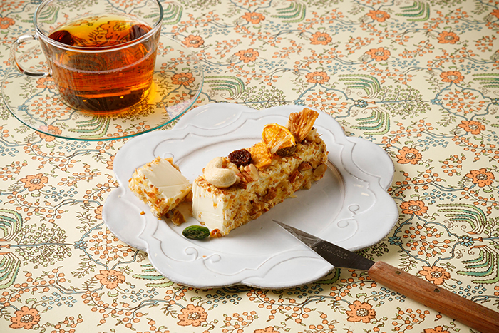 砕いたナッツ(胡桃・アーモンド)をまぶし、ドライフルーツ(オレンジ・いちじく・レーズン)を飾って。ナッツのコクとドライフルーツの甘味がバランスよく「クリームチーズ」を引き立てます。