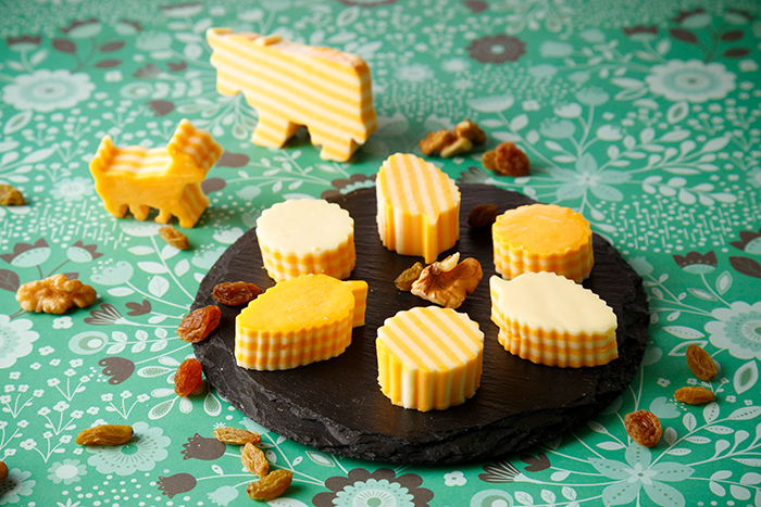 縞々模様が楽しいアクセントに。弾力性のあるなめらかな食感は、重ねたスライスチーズならではのおすすめアレンジです。