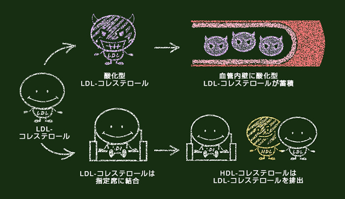 「抗酸化」とか「血液サラサラ」、あるいは「血液ドロドロ」といった言葉をTVでしばしば耳にします。そもそも「血液ドロドロ」とはどういうことなのでしょうか。コレステロールの中で俗に悪玉コレステロールと呼ばれる“LDL-コレステロール”が増え、一部が酸化され“酸化型LDL-コレステロール”になると血管内に蓄積し、血管が狭くなるため血流が悪くなります。すなわち、“血液ドロドロ”となります。その結果、高い圧力をかけないと血液が流れにくくなるため“高血圧”になります。さらに症状が進むと、血管が破れ、重篤な状態を招くことになります。