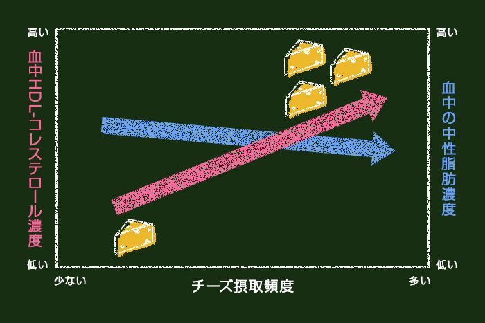 北欧で行われたチーズ摂取量と血中脂質の関係を調べる調査では、チーズ摂取量が多くなるほど血中HDL-コレステロール濃度は高くなっています。一方、中性脂肪についてはチーズ摂取量が多いほど低くなっています(図3)。
