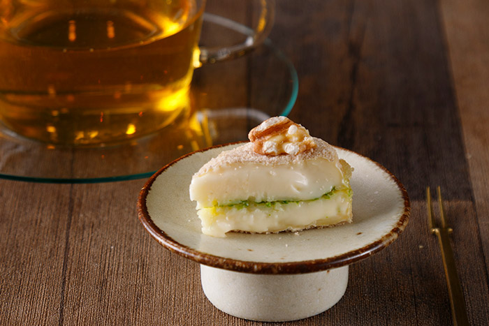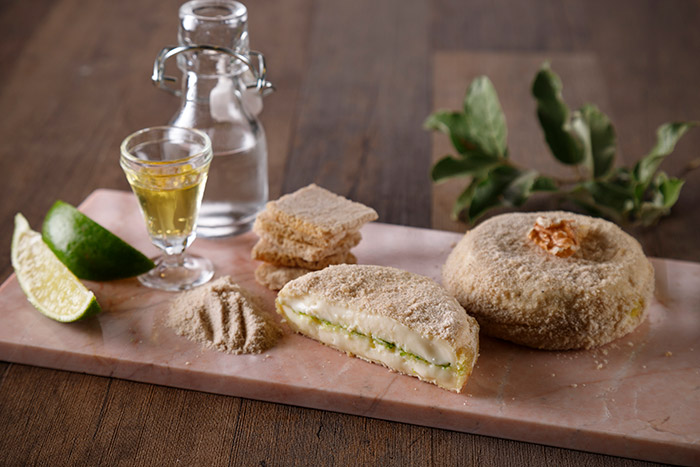 玄米クラッカーをまとわせた「雪印北海道100 カマンベールチーズ」に、ライムとジンを効かせて大人のアレンジに。紅茶と合わせて。