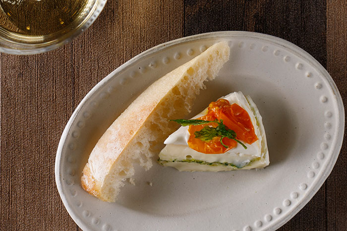- ③②の表面を覆うように「雪印北海道100 マスカルポーネ」を塗り、セミドライトマトをバランスよく並べ、素揚げしたバジル、オレガノをトッピングする。