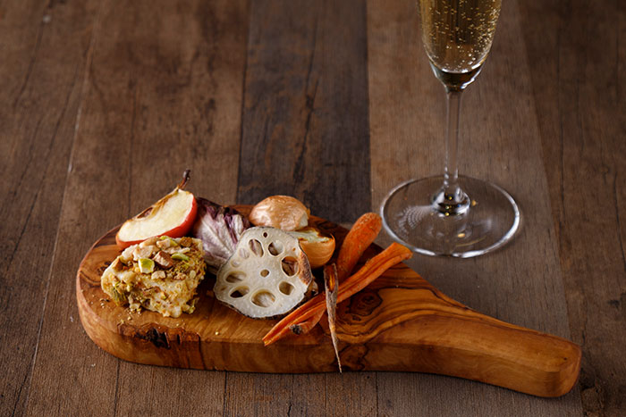 「雪印北海道100 カマンベールチーズ」にデュカをまとわせ、グリル野菜や果物と合わせた1品、チーズの味わいが引き立ちます。