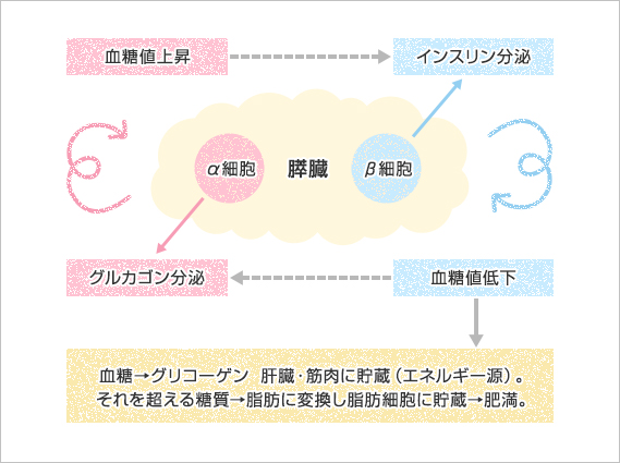 一般的に、食事をすると炭水化物が分解されグルコースとなり血中に移行します。すると、膵臓からインスリンというホルモンが分泌され、グルコースを筋肉に貯蔵します。貯蔵されたグルコースは運動する際にエネルギー源として使われます。しかし、炭水化物摂取量が多く日常的な運動をあまりしないと筋肉だけでは収納しきれなくなり、脂肪に変換され脂肪細胞に蓄えられます。なので、日常的に運動量が少ないにも関わらず過剰に炭水化物を摂取していると、肥満のリスクが高くなる可能性があります(図1)。