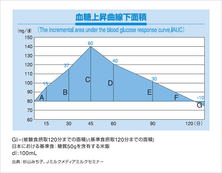 しかし、インスリンの分泌が少ない方は血中グルコースを筋肉に貯蔵しにくいので血糖値が高い状態が続きます。これが糖尿病です。したがって、糖尿病の方は血糖値の上昇を緩やかにし、少ないインスリン量でもグルコースを筋肉に貯蔵できるようにすることが必要です。図2は、食事摂取後の血糖値が上昇して元の値に戻るまでの血糖値変化を示したもので、基準食(日本では糖質を50g含む米食)と被験食(調べたい食品)の面積の比をグリセミック指数(GI値)といいます。