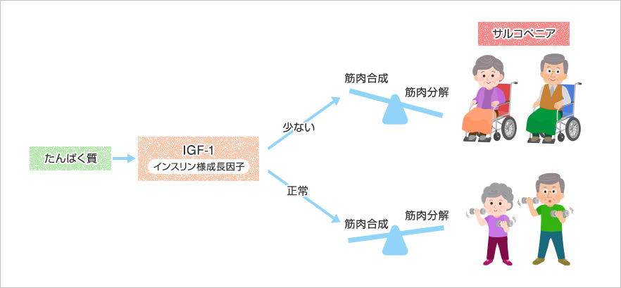 私たちの筋肉は合成と分解が日常的に行われており、通常は両者のバランスがとれています。運動により筋肉が分解されればインスリン様成長因子(IGF-1)というホルモンが筋肉の合成を促します。しかし、IGF-1の少ない方は分解される筋肉を補うだけの筋肉が合成されません。そのため、筋肉量が減ったり筋肉の機能が低下したりするサルコペニアという状態になりやすくなります。特に、高齢者の方は食事量が少ないことからサルコペニアになりがちです(図3)。