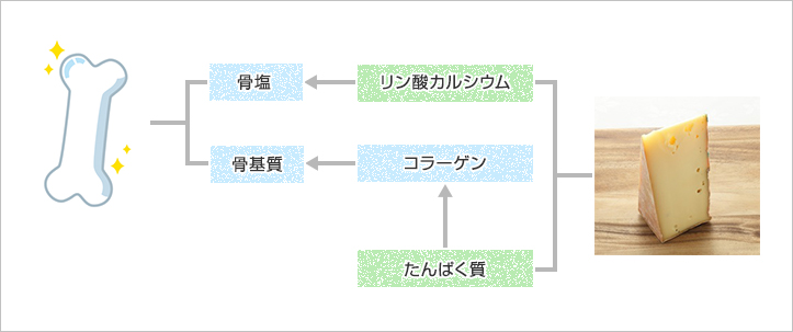 骨は骨塩(主としてリン酸カルシウム)と骨基質(主としてコラーゲン)からできています(図4)。建物に例えれば、骨基質は柱、骨塩は壁に相当します。柱が弱く、壁だけしっかりしていても、逆に柱は強いけど壁が薄っぺらだと建物としては不合格ですよね。骨も骨塩のみならず骨基質もしっかりしていないと強靭でしなやかな骨になりません。コラーゲンはたんぱく質なので、良質なたんぱく質を原料として生体内で合成されます。チーズをはじめ牛乳やヨーグルトは豊富なリン酸カルシウムと良質な乳たんぱく質の供給源です。