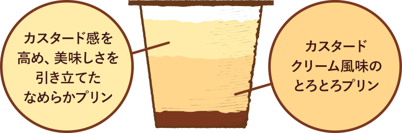 風味と食感の異なる2層のプリンを濃厚なクリームが