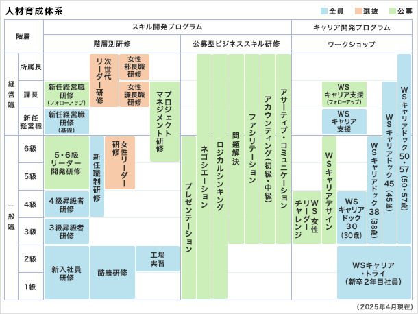 階層別の各役割要件に合ったスキルを設定し、マインド・思考等の強化と合わせ計画的にリーダーシップスキルを習得するプログラムを展開しています。公募型のビジネススキル研修にはグループ会社従業員も参加し、アカウンティング、ロジカルシンキング、リーダーシップ等のスキルの向上に取り組んでいます。