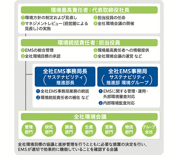 雪印メグミルク(株)の環境マネジメントは、環境保全活動の最高責任者である社長をトップに、環境担当役員を環境統括責任者とする環境マネジメントシステム(EMS※1) によって総合管理をしています。また、各部門には環境管理責任者をおくことで、全員参加型の環境マネジメントに取組み、ISO14001:2015※2に準拠した環境マネジメントシステムを推進しています。