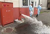 | 水を使った「生乳流出時」の対応訓練(雪印メグミルク㈱幌延工場) |