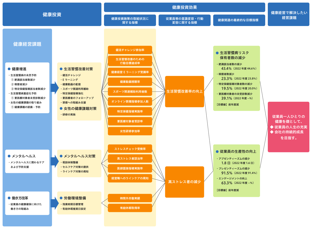 メンタルヘルスに関わるケアおよび予防支援の取組みを推進致します。 - (3) 従業員の健康確保に向けた働き方の取組みを推進致します。