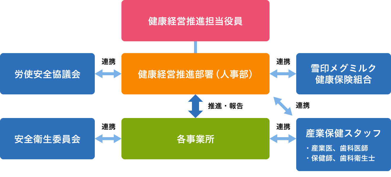 雪印メグミルクは、食の楽しさや健康をお届けし、食の未来を創造する企業として、従業員が心身ともに健康であることを尊び、健康の維持・増進に向け、自ら行動していくことができるよう、以下の取組みを推進し、支援していくことを宣言します。