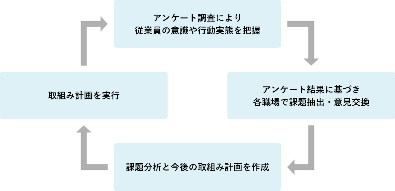 雪印メグミルクグループでは、全従業員を対象にコンプライアンスを中心としたアンケートを2年に1回実施しています。アンケート結果に基づき、現状の実態把握を行い、翌年抽出した課題について対応します。