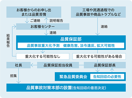 雪印メグミルク(株)は、日々のお客様からのお申し出から入手された商品の品質に関わる情報や、工場・店舗からのトラブル・苦情情報は、品質保証部に伝えられます。健康危害、法令違反、事故拡大など重大化する可能性があると判断された場合には、緊急品質委員会を開催し、事実関係を調査・把握し、速やかに必要な対応を講じます。委員会での検討の結果、新聞などでの告知回収など、会社経営上の速やかな決断が必要な場合は、社長を対策本部長とする品質事故対策本部を設置し、対応します。