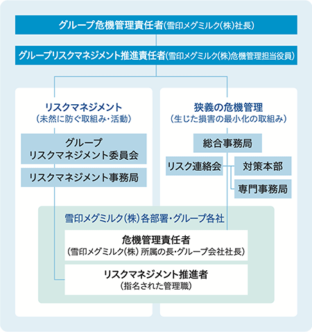 雪印メグミルクグループは、経営に好ましくない影響を与えるリスクについて、生じる損失を最小にするとともに、未然に回避または影響を低減させるために、「雪印メグミルクグループ 危機管理基本方針」を定めました。経営の安定性を確保し、グループの健全かつ持続的な成長が可能な状態を維持することを目指します。