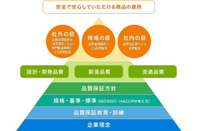 - 1. 消費者を重視した品質保証体制のもと、法令・社内基準を遵守し、安全で安心していただける商品を提供します。