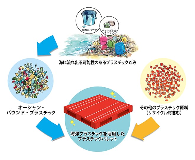 雪印メグミルク(株)では、製品の輸送や保管に用いる荷役台として、海洋プラスチック(OBP:オーシャン・バウンド・プラスチック)を配合したパレットを導入しました。海洋プラスチックを配合したパレットを採用することにより、更なるプラスチック資源循環を図ります。2024年度は約6,000枚を導入する予定です。