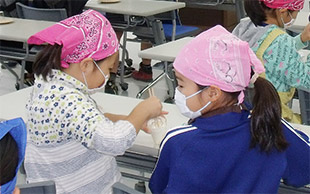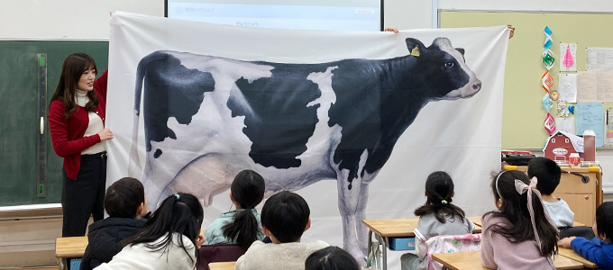 食育活動の一環として、小学生を対象に食育出前授業を実施しています。授業を通じて毎日給食で出る牛乳の役割を伝え、牛乳・乳製品が成長に大切な食品であることを知ってもらうお手伝いをしています。
