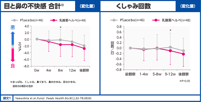 「乳酸菌ヘルベ」を含む発酵乳の継続摂取により、花粉やハウスダストによる目や鼻の不快感が、プラセボ食の摂取と比較して有意に緩和されました。