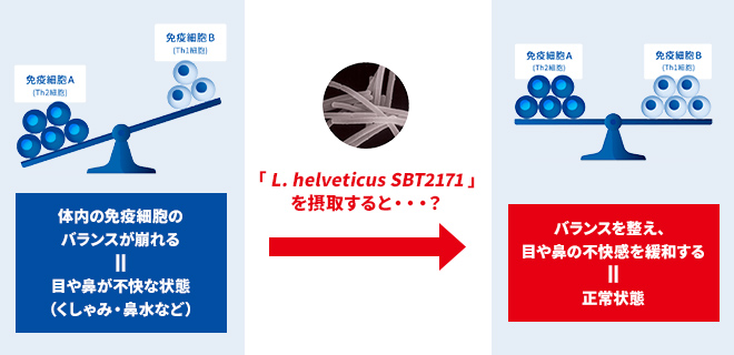 本品の届出表示では「本品にはL. helveticus SBT2171(乳酸菌ヘルベ)が含まれます。乳酸菌ヘルベには花粉やハウスダストなどによる目や鼻の不快感を緩和する機能があることが報告されています。」とあります。