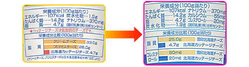 カルシウムを意識してチーズを食べるお客様の声にお応えするため、チーズ商品に、法令に基づいて表示している栄養成分5項目(エネルギー、たんぱく質、脂質、炭水化物、ナトリウム)に加えてカルシウムの栄養成分量も表示することにしました。※写真は「北海道カッテージチーズ」の例