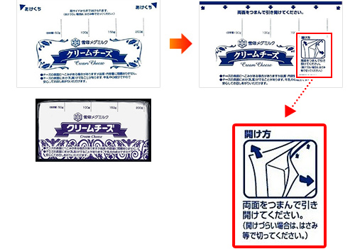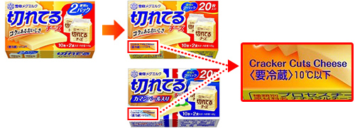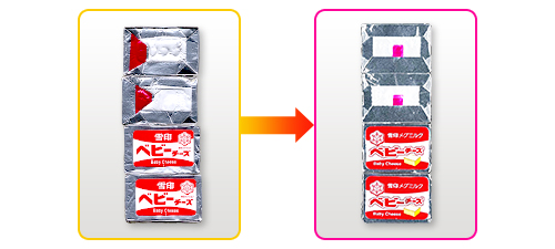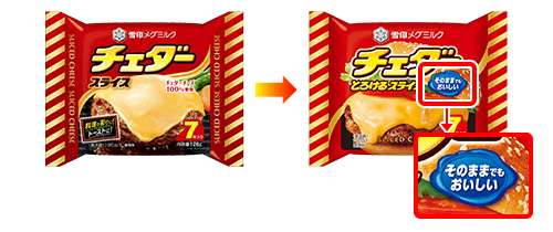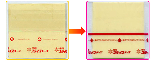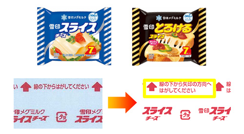 - チーズを包む透明フィルムのはがし口を分かりやすくしました。[雪印 スライスチーズ]