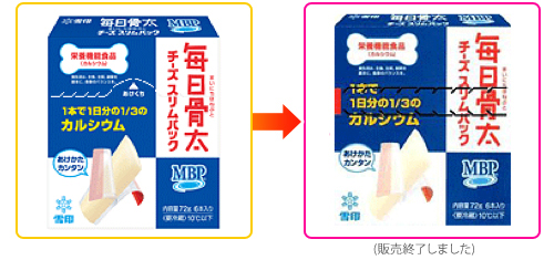 [雪印 毎日骨太MBP® チーズ スリムパック]2009年5月(販売終了しました) - パッケージに商品の原材料による特性を明記しました。