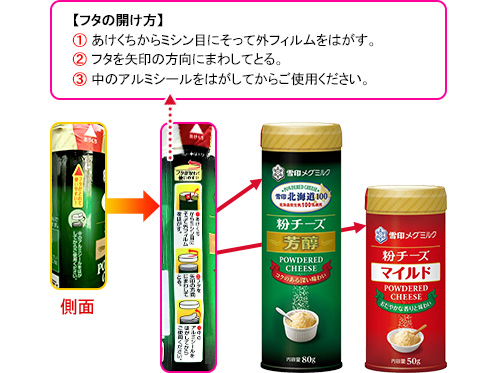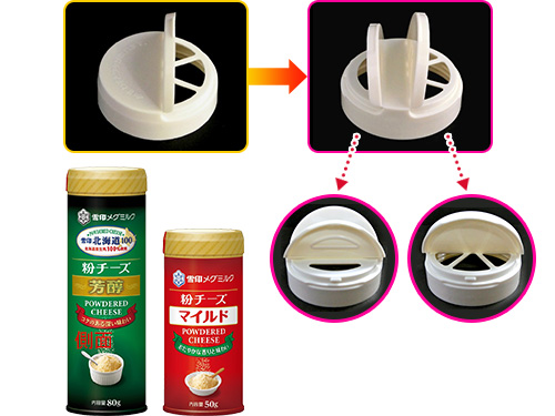 フタのあけくちを2種類に増やし、お好みの量に合わせてチーズを振り出せるようにしました。