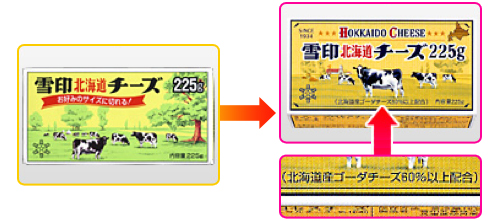 商品名のように、パッケージで伝えている産地名や原料チーズについて、お客様に正しい内容を知っていただくために、パッケージ表面に産地および原料チーズとその配合率を表示しました。(「北海道チーズ」は、北海道産ゴーダチーズを60%以上配合しています。)