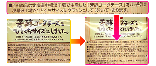 北海道で作ったナチュラルチーズなのに、なぜ製造者が八ヶ岳乳業なのか、その理由をパッケージの裏面に記載しました。その内容は「この商品は北海道なかしべつ工場で生産した「雪印北海道100 芳醇ゴーダ クラッシュ」を八ヶ岳乳業小淵沢工場でひとくちサイズにクラッシュして(砕いて)おります。」