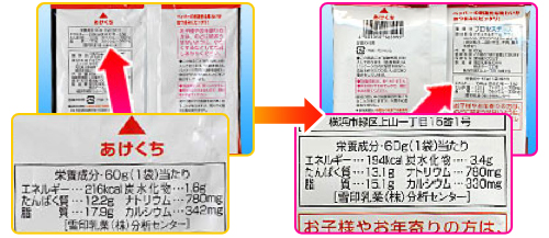 お客様にとって必要な情報の優先順位を考慮しつつ、栄養成分や原材料などの表示が開封によって切り取られない位置へ変更しました。