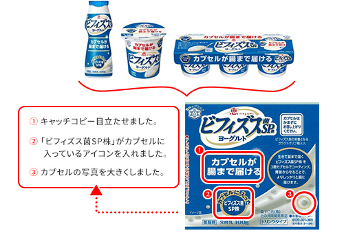 つぶつぶが、「ビフィズス菌SP株」を入れたカプセルであることを分かりやすく表示しました。